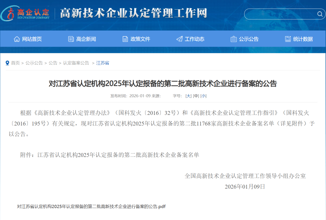 近日,根据《高新技术企业认定管理办法》及相关规定,全国高新技术企业认定管理工作领导小组办公室对江苏省认定机构2025年认定报备的第二批企业进行备案公示。710公海寰宇凭借其扎实的科技创新实力与完善的研发管理体系,成功荣列在本次备案中。